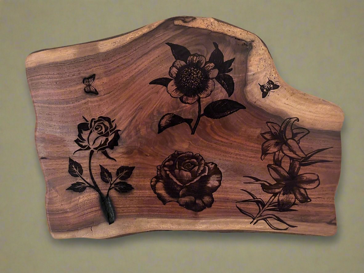 This is a beautiful Black Walnut Plaque with a variety of flowers burnt into the face.This will look great on any wall. Measuring 24" wide and 21" high.