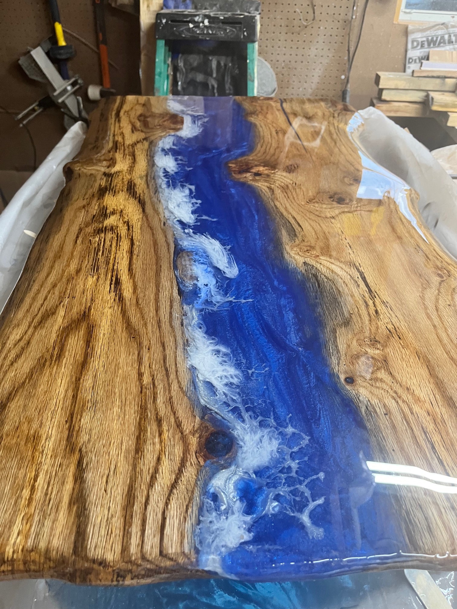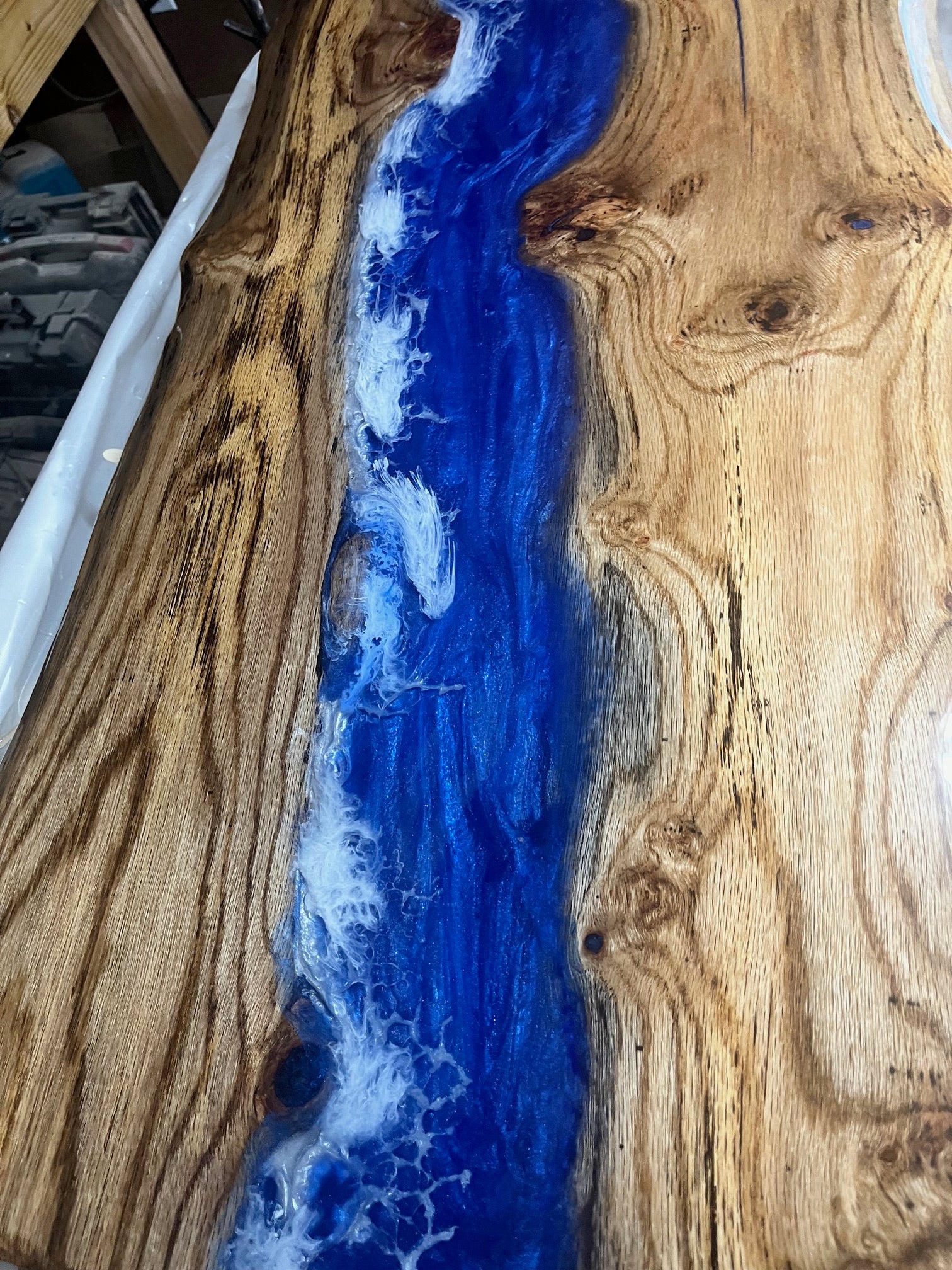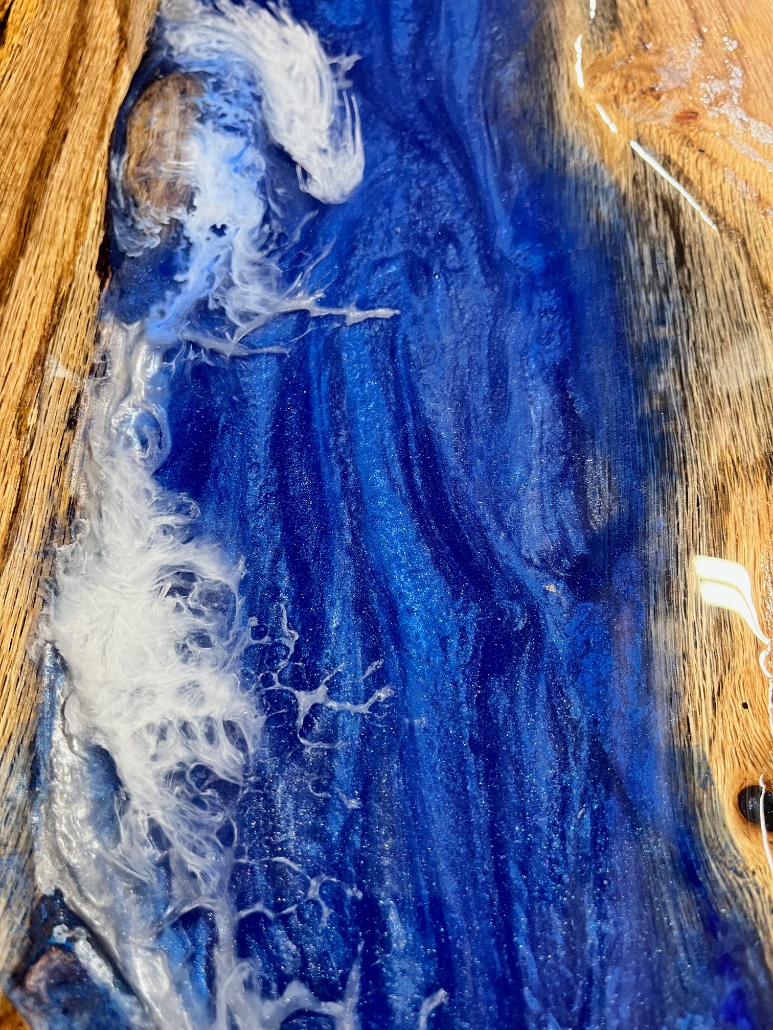 This beautiful white old live edge coffee table has a stunning blue river with white crashing waves in the center. Metal legs with two coats of uv rated epoxy on it. One of a kind piece could be yours or you can order one to your specifications, simply email us and we can get the process started.