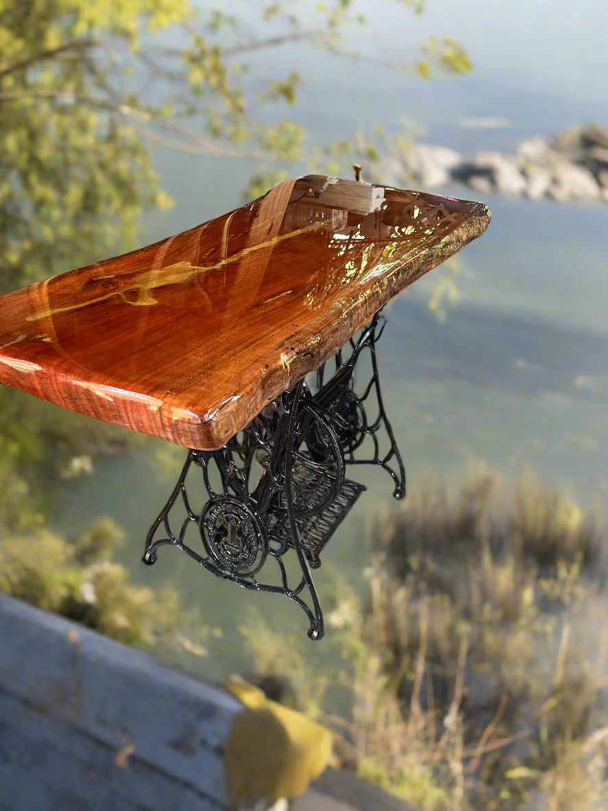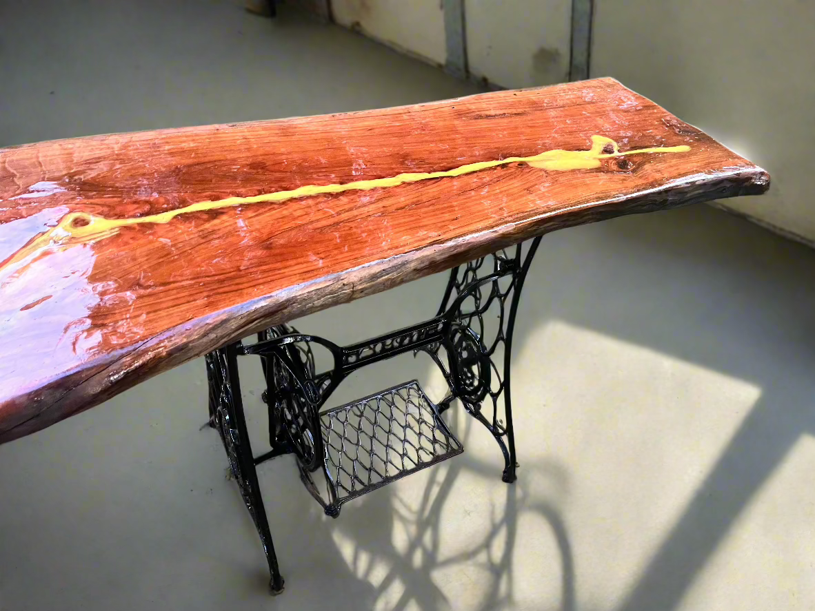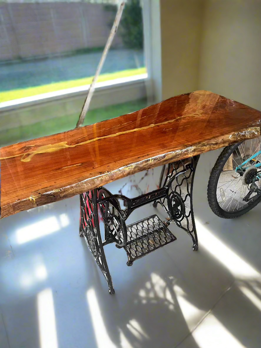 Live edge Cherry with gold river on top of Antique Singer black metal stand. 57” wide 17” on one side 20” on other side deep. It has two coats of clear epoxy. Makes a great hallway table or under a window. This one of a kind table will look great in your home. We can customize one of these for you text me with your preference.