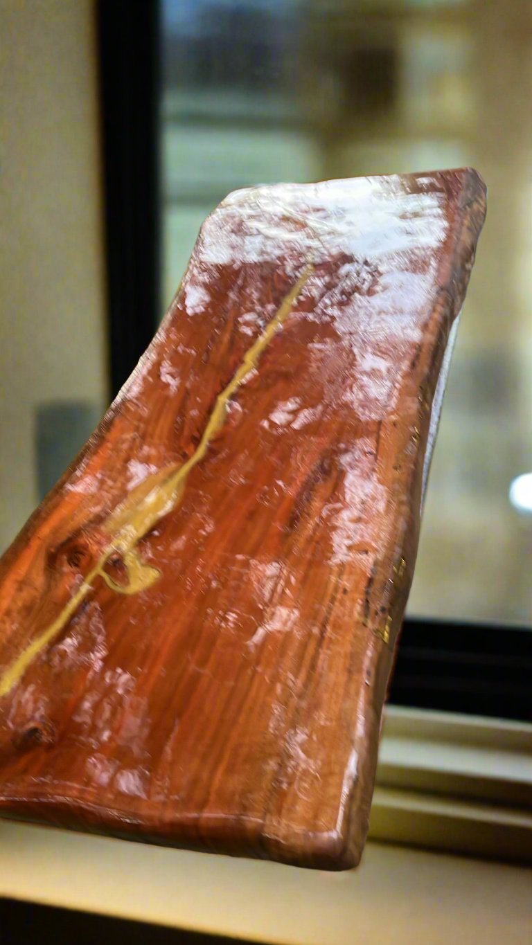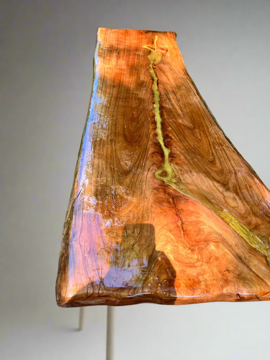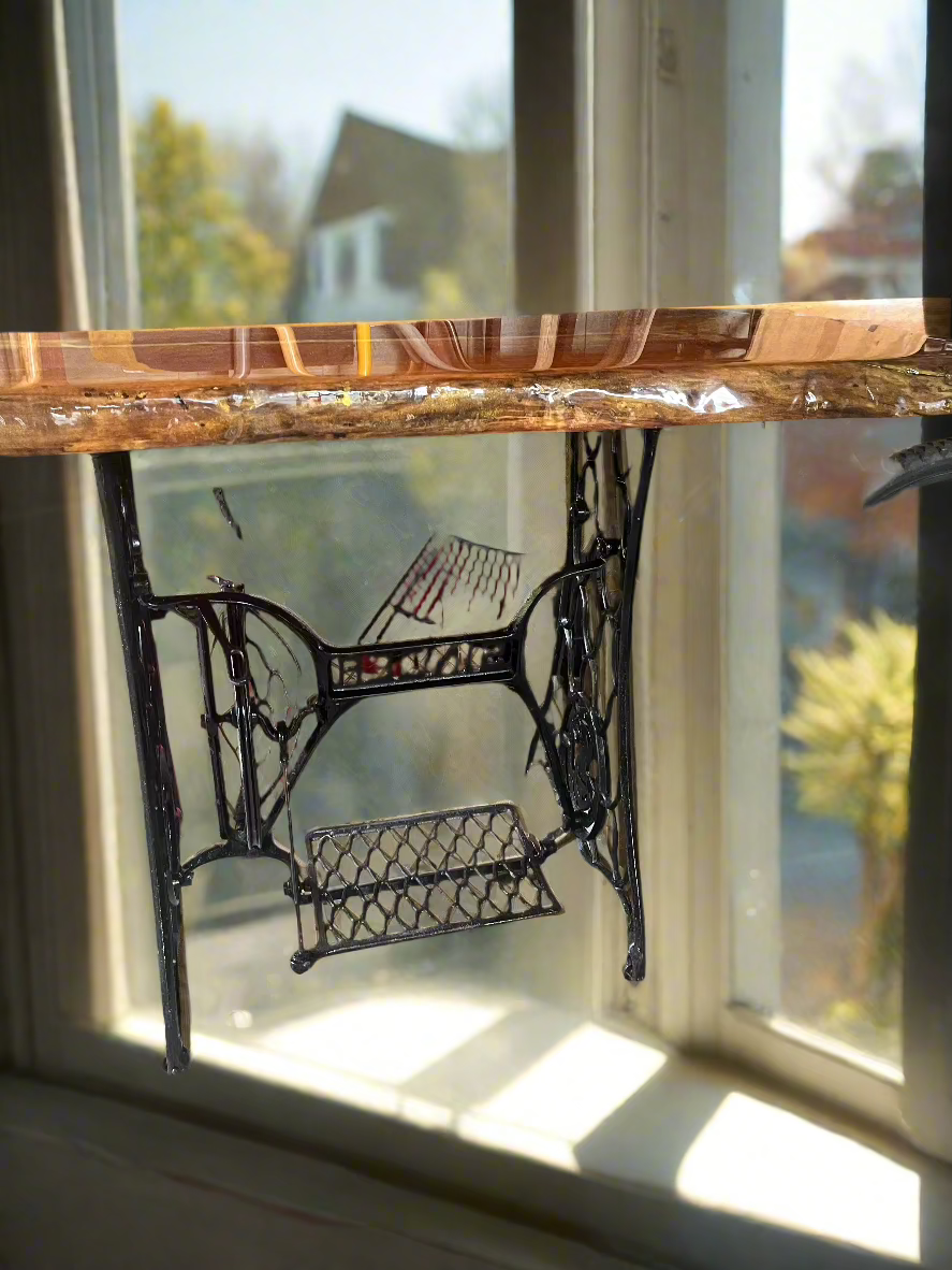 Live edge Cherry with gold river on top of Antique Singer black metal stand. 57” wide 17” on one side 20” on other side deep. It has two coats of clear epoxy. Makes a great hallway table or under a window. This one of a kind table will look great in your home. We can customize one of these for you text me with your preference.