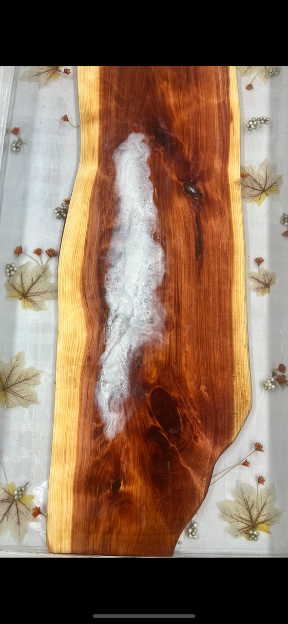 Transform your kitchen with the Kitchen Live Edge Red Cedar Island. Hand-crafted and featuring a unique red cedar live edge design, this island adds a touch of sophistication to any space. The epoxy coated clear finish not only adds durability, but showcases the exquisite details of this river table.