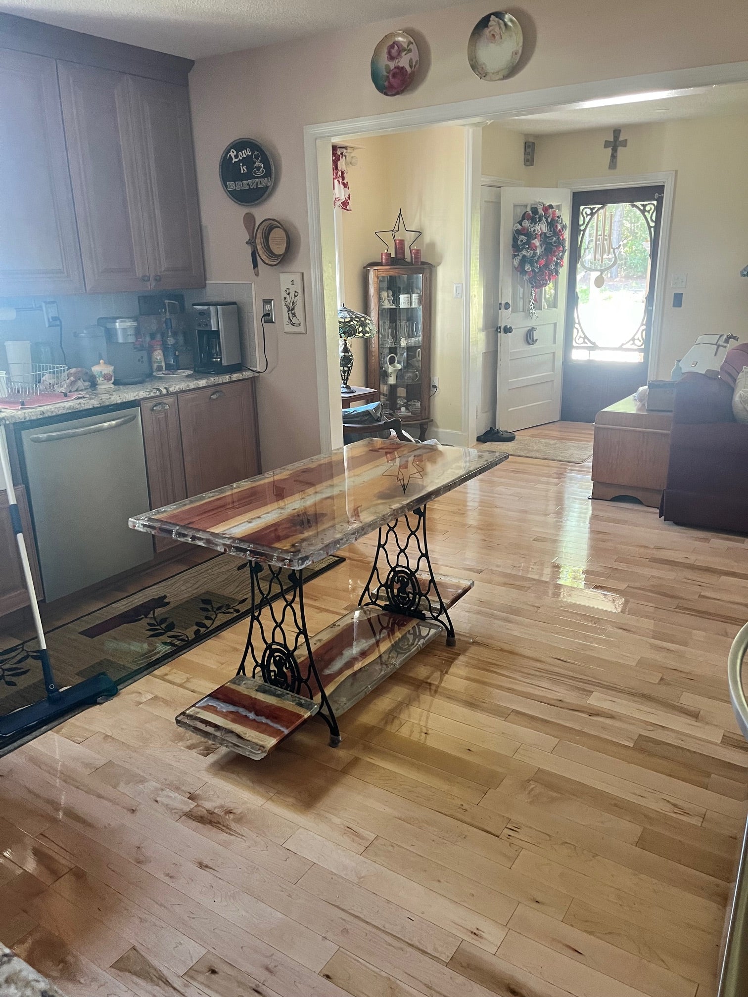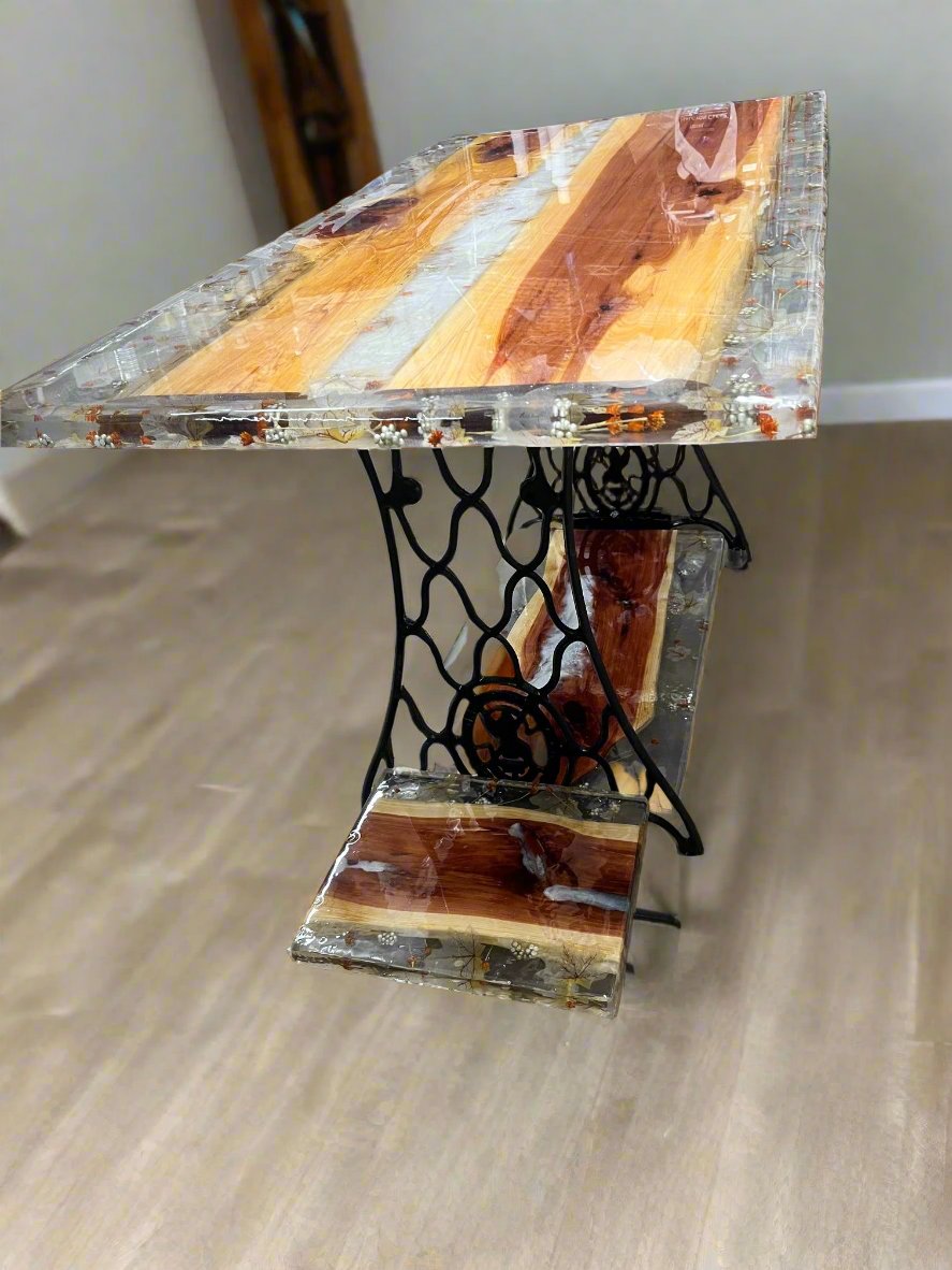 This hand made red cedar clear epoxy kitchen island will look amazing in your home. None other like it. Measures 53" long by 28" wide s itting on metal legs from Singer Sewing Machine at 28" tall.
