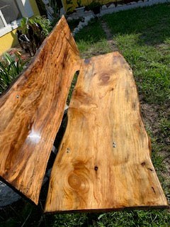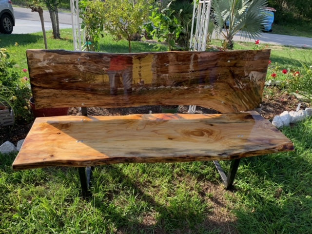 This one of a kind live edge hickory park bench is epoxy coated, Hand crafted bench is 46" long 38" high back and has metal iron legs. Absolutely Beautiful piece.