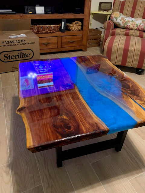 Another Red Cedar Blue River Coffee TableHas Blck metal legs 16" tall.. (Blue rivers is our most requested color river). The blue river seams to overflow onto the table itself. measuring 24" wide 34" long and 1.75" thick beautiful. THESE TABLES ARE TO BE MADE TO ORDER ALLOW 4 WEEKS TO MAKE CONTACT USE TO LET USE KNOW WHAT YOU LIKE AND WANT