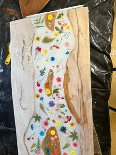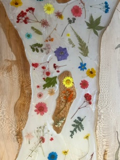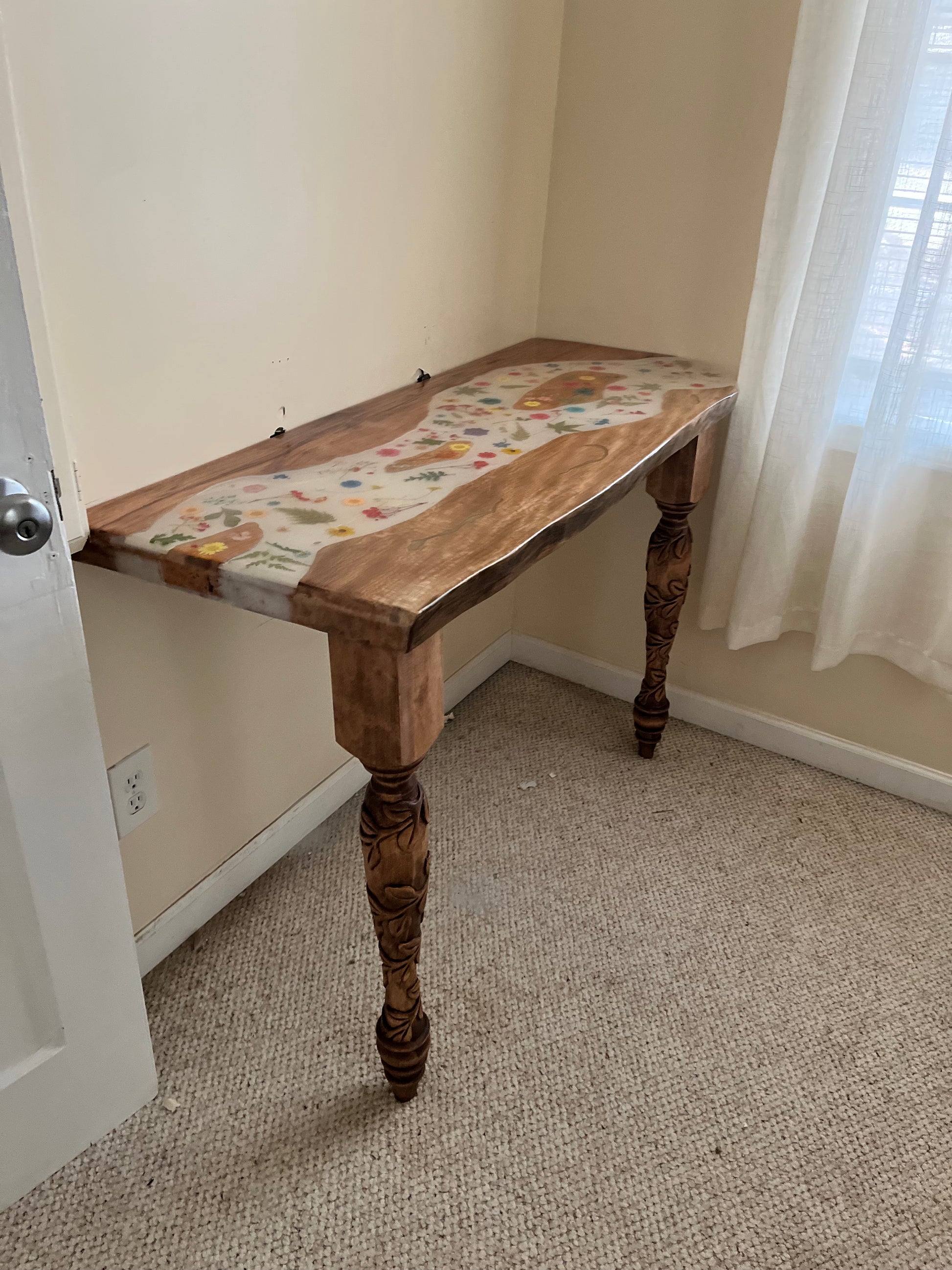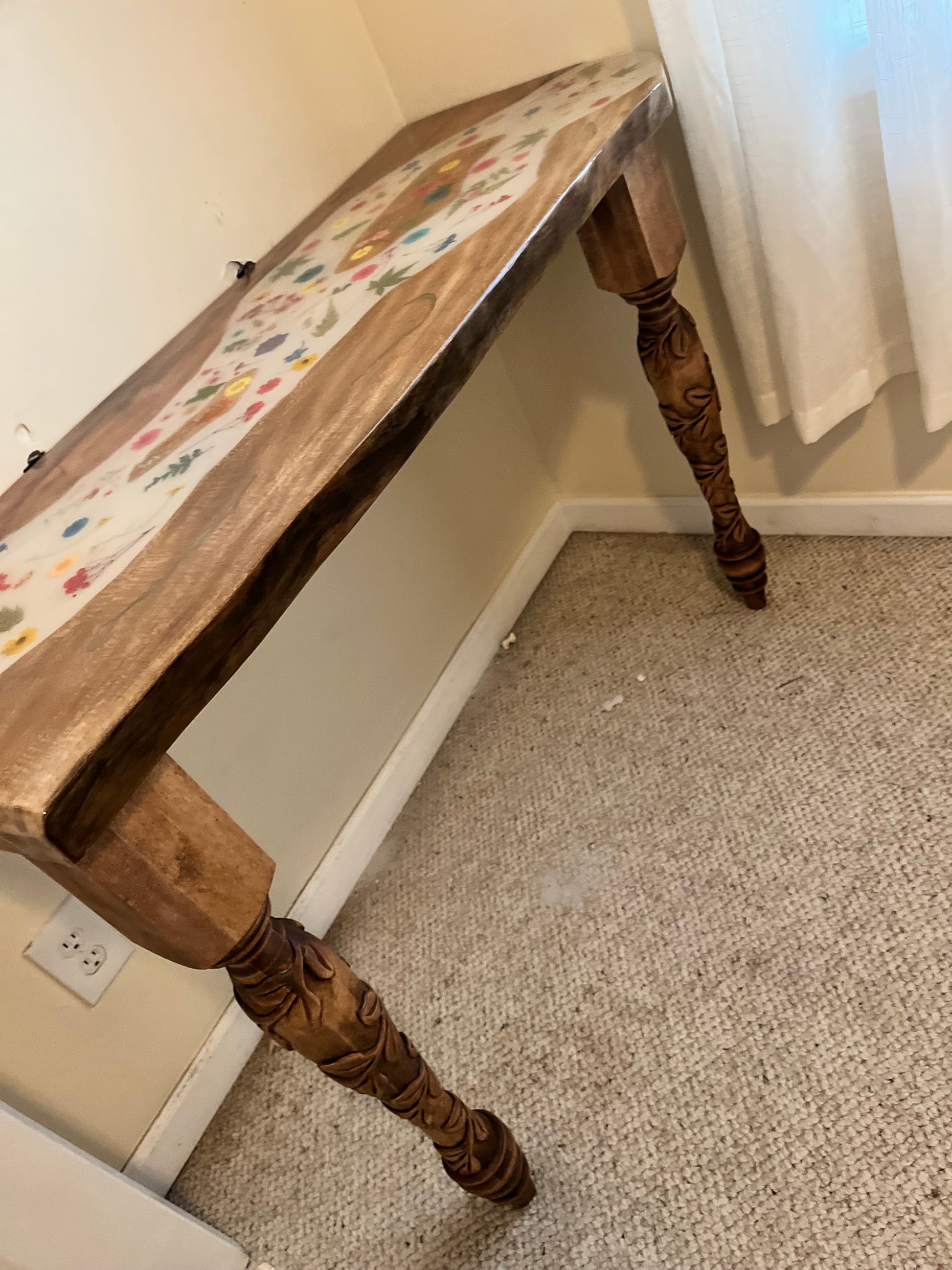 This semi floating table with two beautiful carved wood legs is 23"deep and 43" long and 1.75 thick. It has a with pearl epoxy river with flowers floating in it. Fastsens to the wall with 3 floating wall anchors. Oh and it even has a tiny island, How Cool!! THIS TABLE IS SPECIAL ORDER pLEASE ALLOW 4WEEKS TO MAKE TO TOUR SPECIFICATION