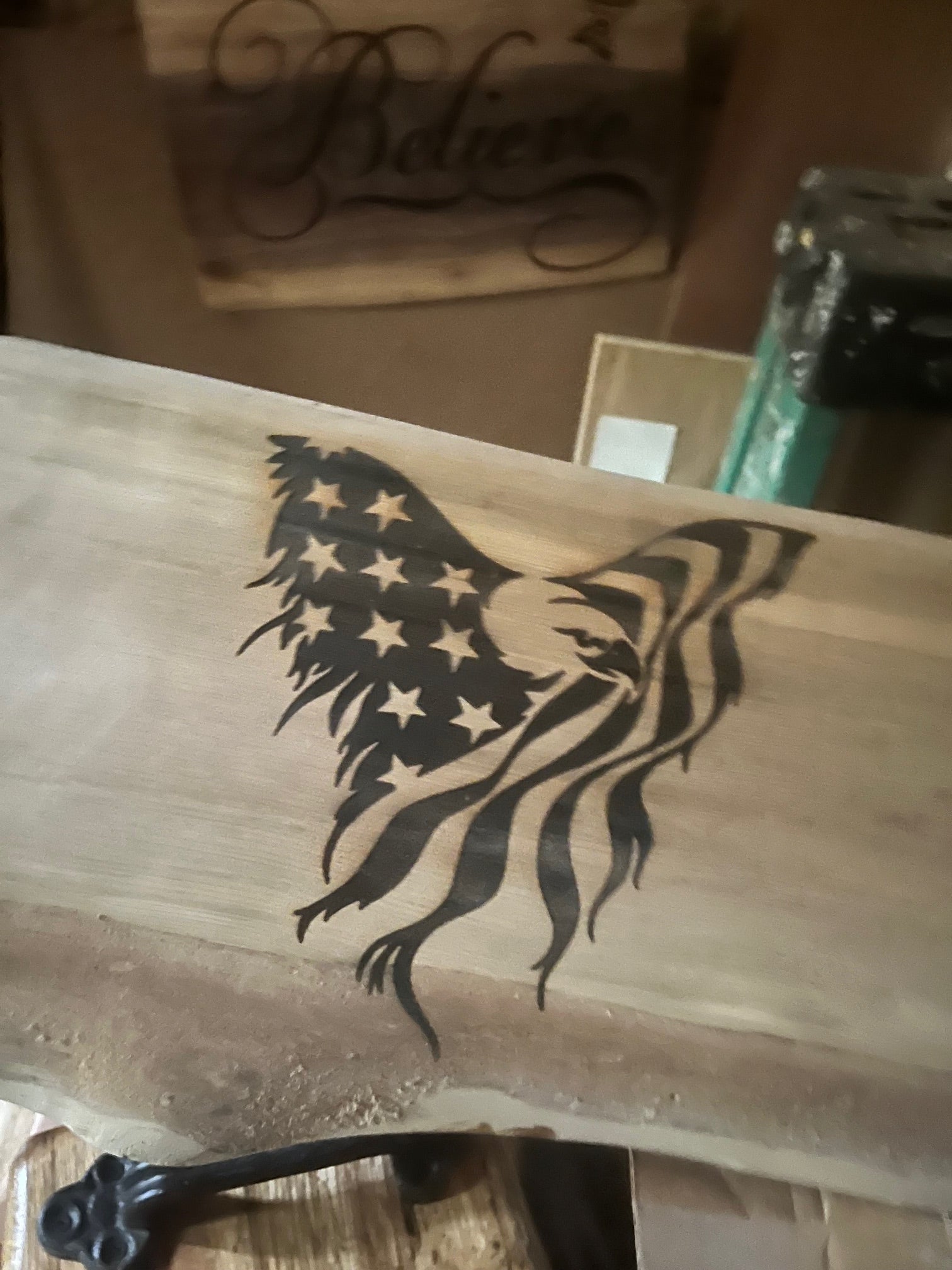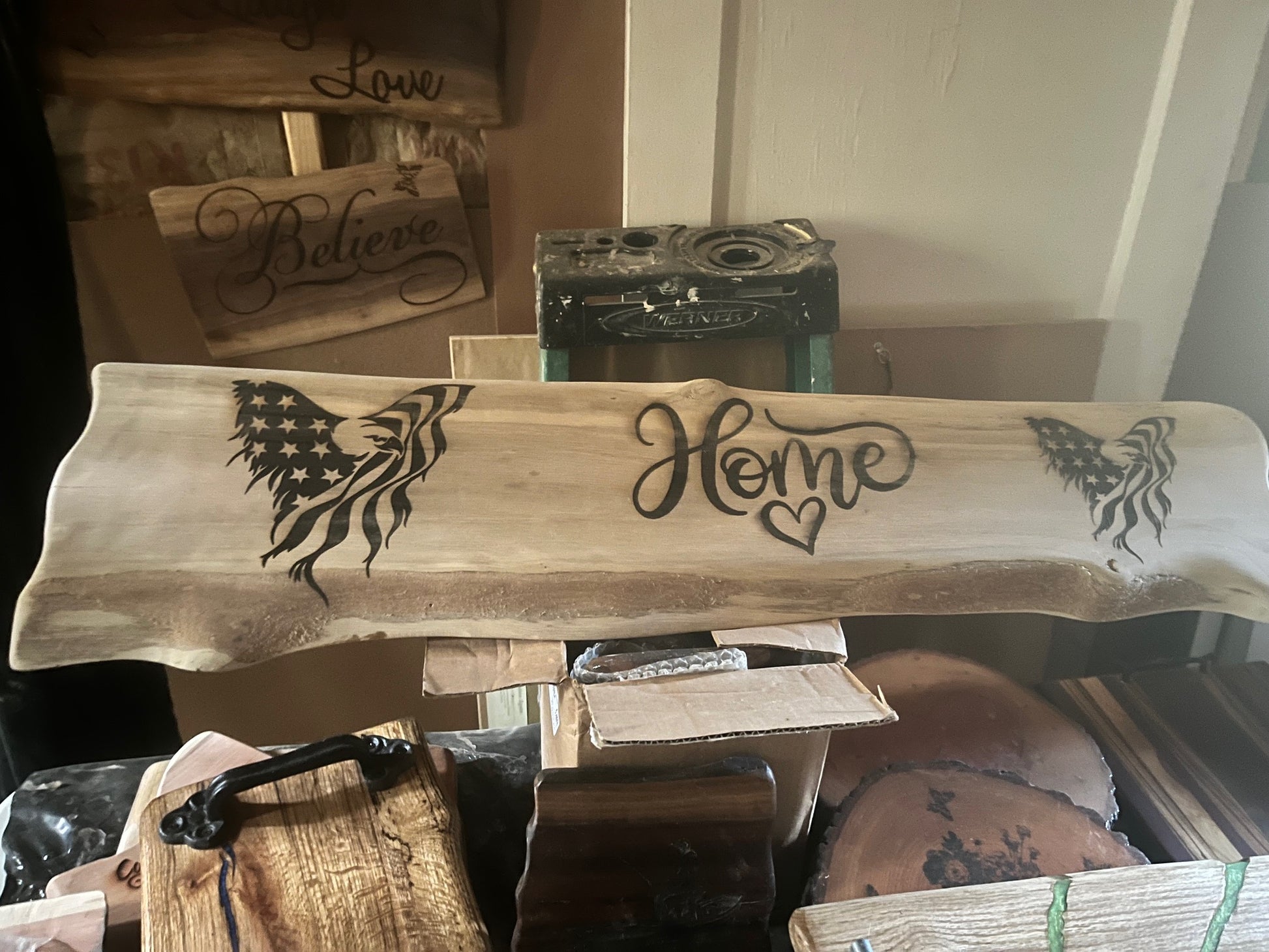 Expertly crafted with live edge wood, this 38" x 8" x 1.25" wall hanging features laser-engraved eagle flags on each side of the elegant "HOME" in the center. Bring a touch of patriotism and rustic charm to any living space with this unique piece.