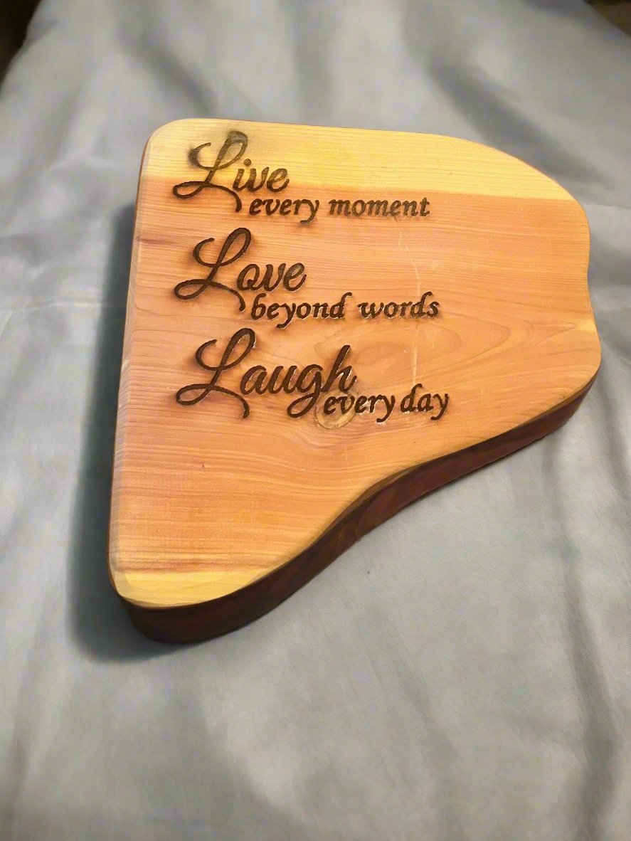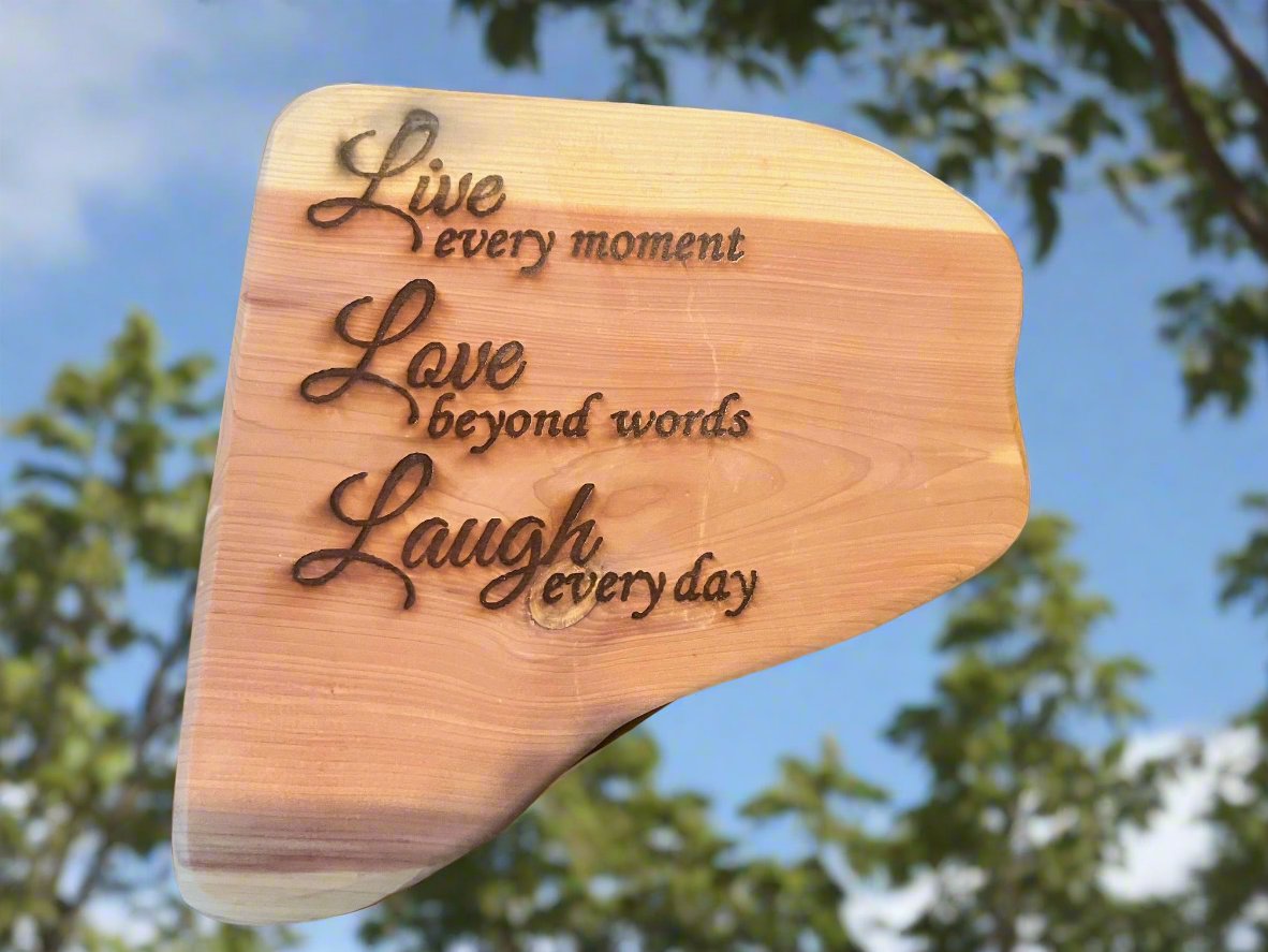 Elevate your home decor with our Live every moment, Love every word, Laugh every day, Red Cedar Plaque. Crafted from the highest quality red cedar, this unique hanging plaque features the motivational message "Live Love Laugh". Made to last, it adds a touch of warmth and positivity to any space. Bring joy to your home or give it as a heartfelt gift. Measuring 7"x 7" with wall hanging bracket on back.