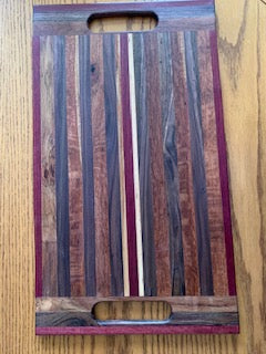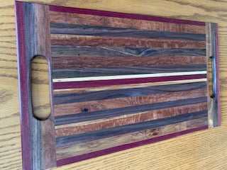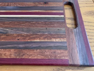 This one of kind charcuterie has purple heart, black walnut and maple wood. Oil treated and has open handles on each side