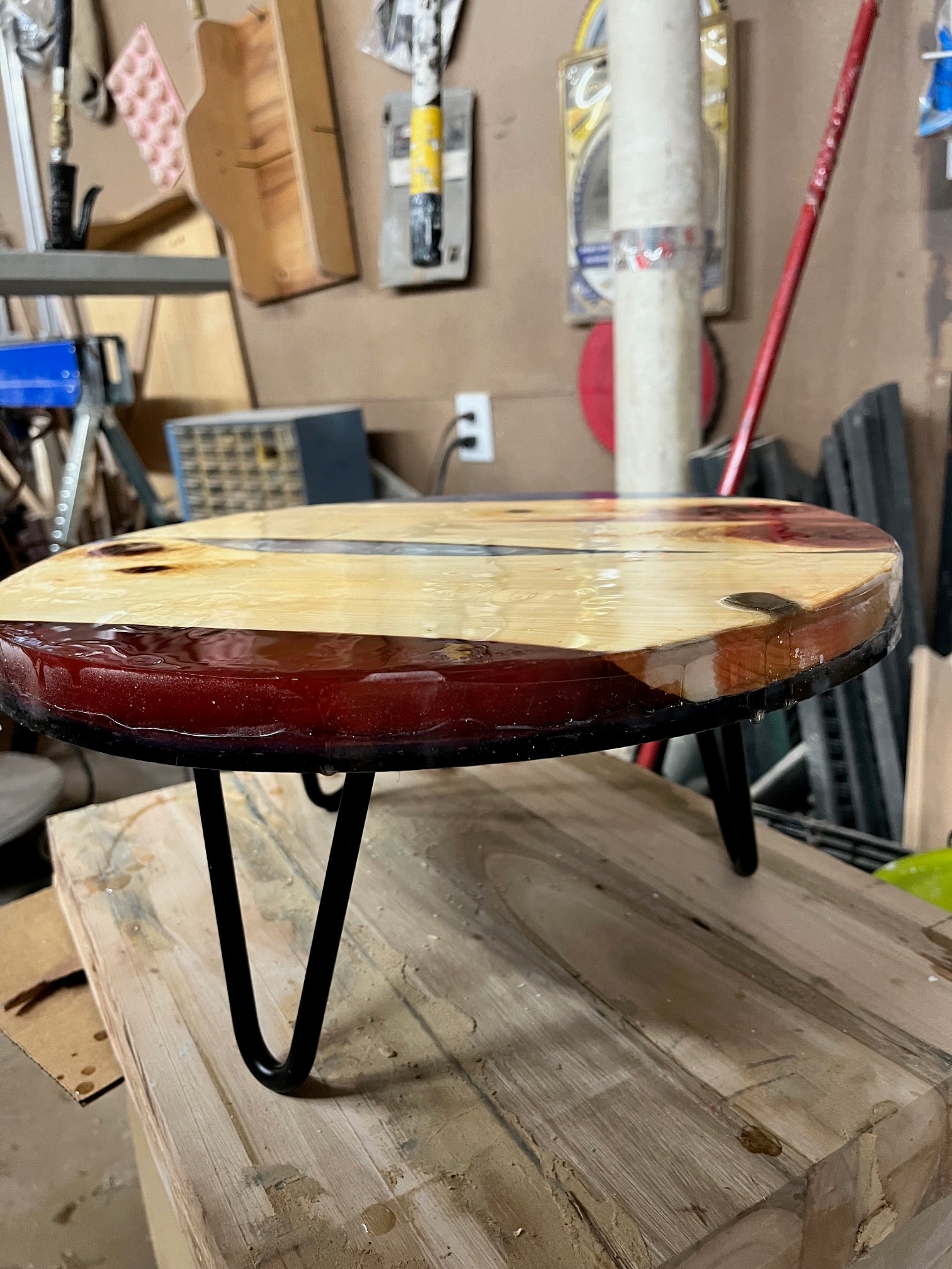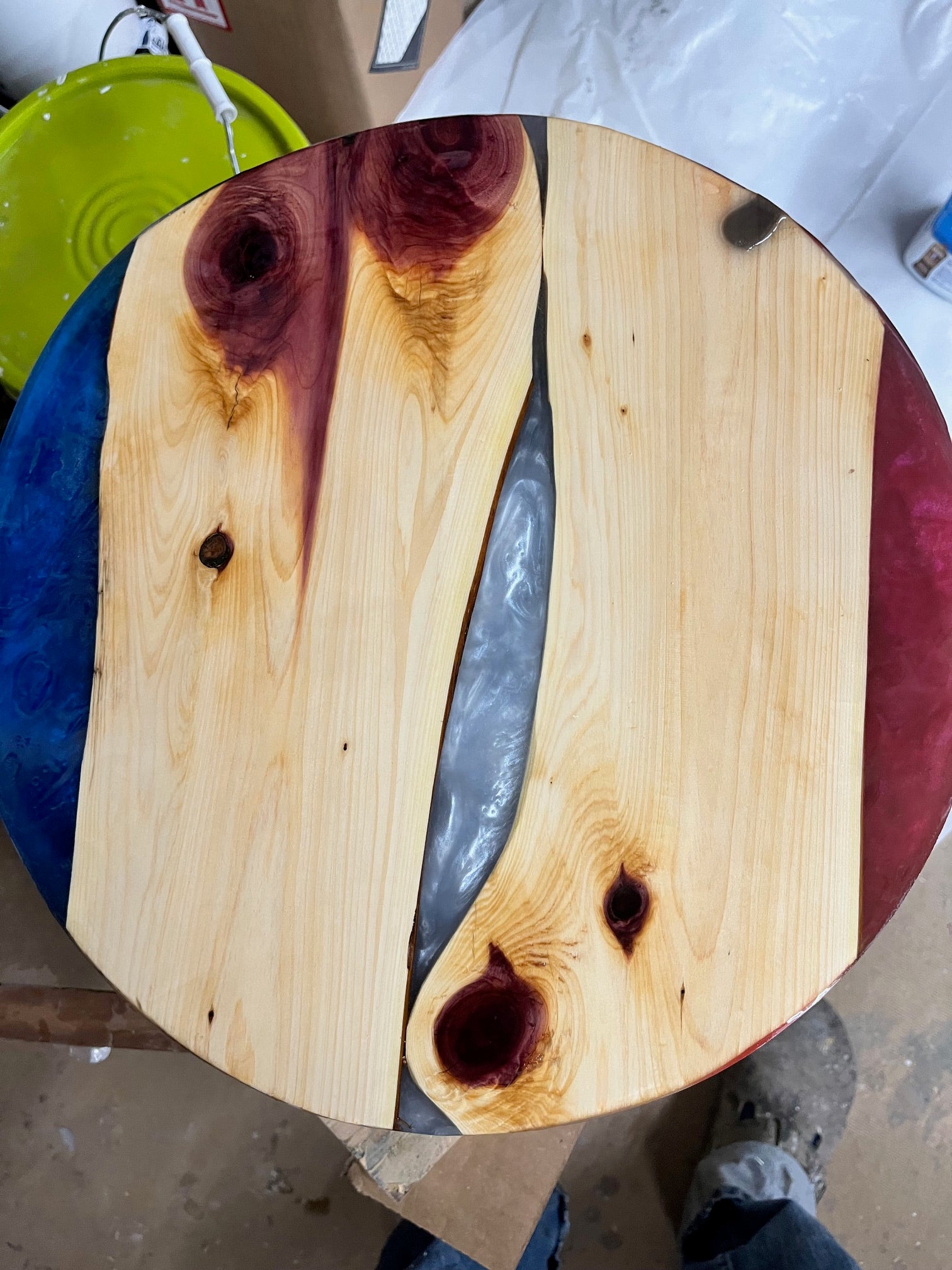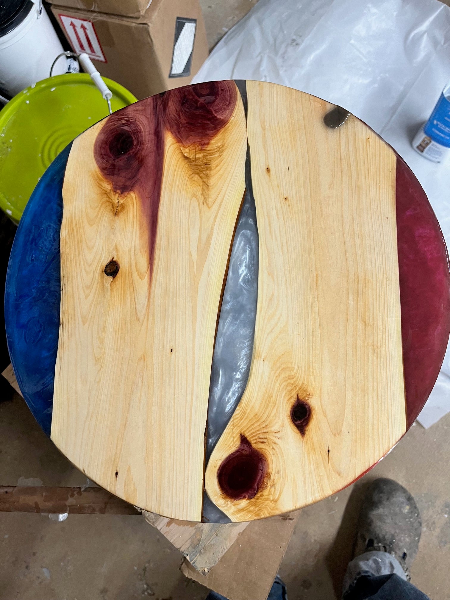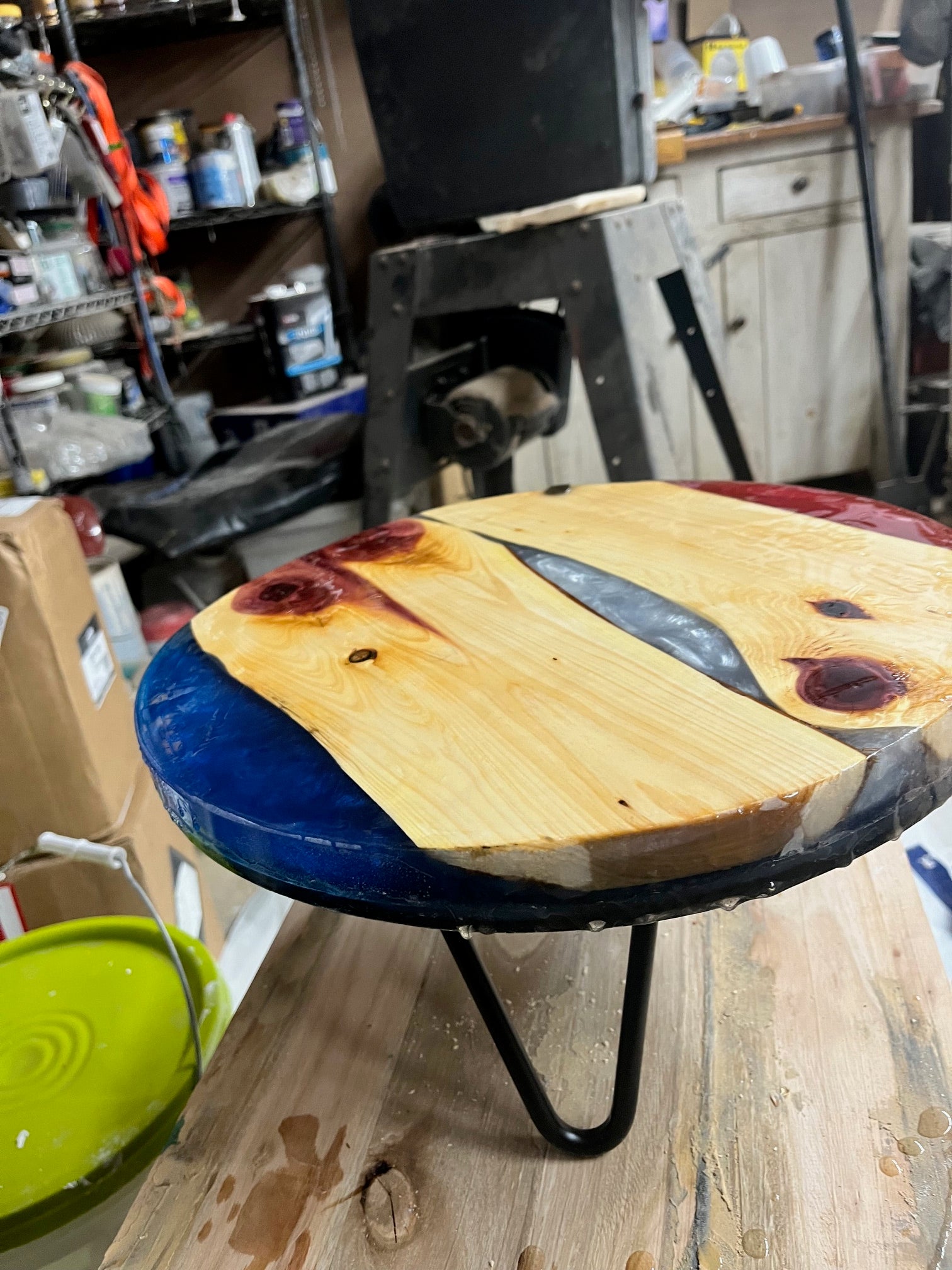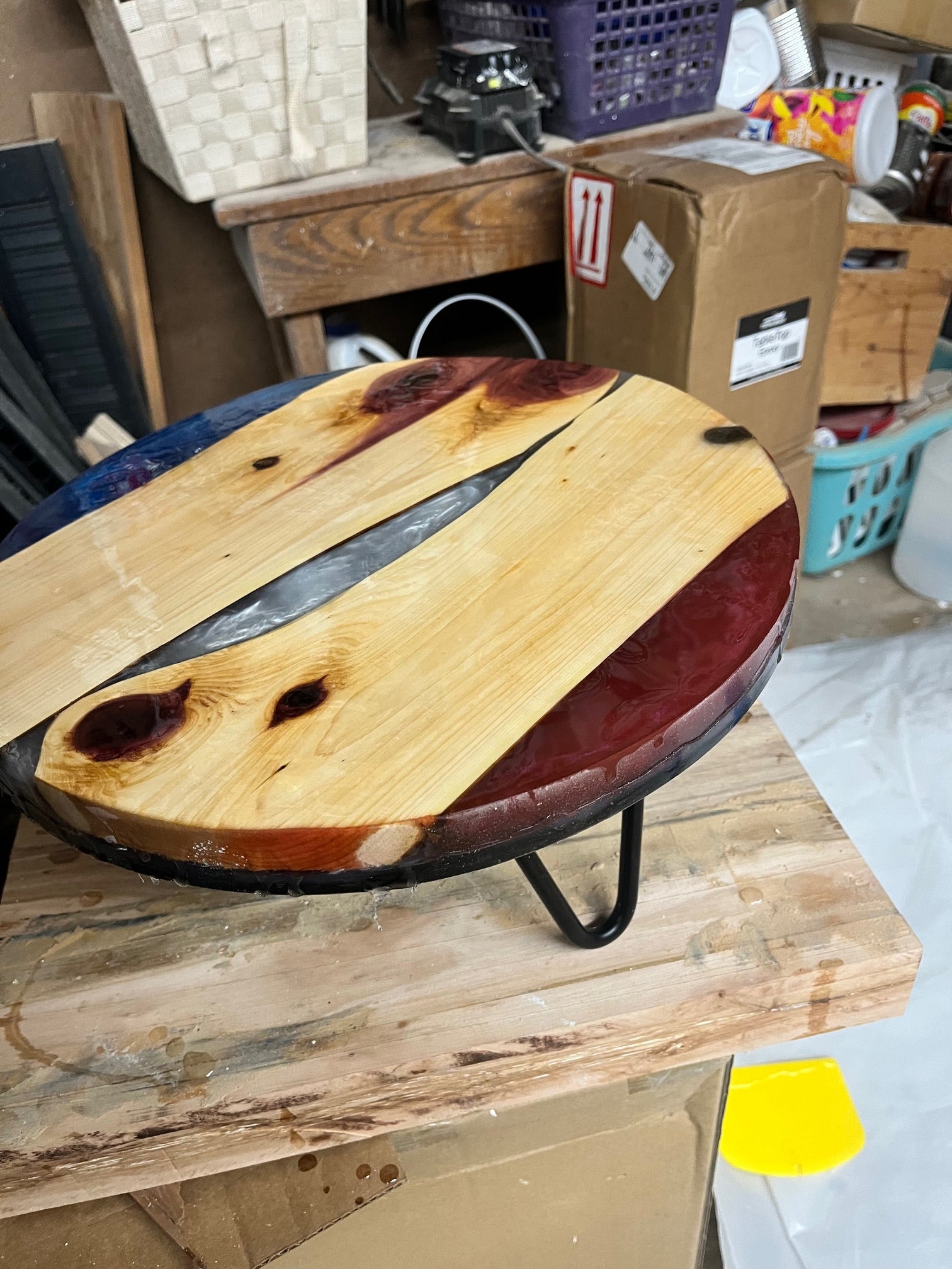 This one of a kind Plant Stand is 14" round 4" tall stand with black metal legs is a beautiful addition to you home. Red White and Blue epoxy rivers in it with Red Cedar live edge inside.