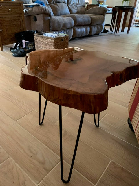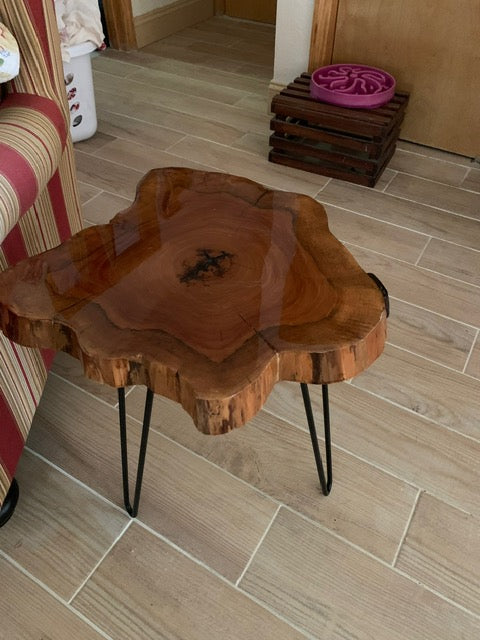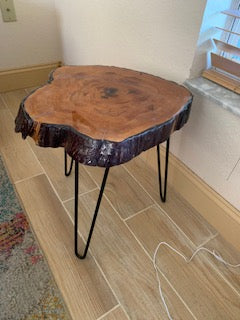 These cute little plant stands are made of Red Cedar about 2.25" thick and 13-15" diameter. Epoxy coated so water will not hurt them. They have 16" wire legs and can be put anywhere in the house or on the patio. No two are alike. PLEASE CONTACT USE SO WE CAN MAKE THIS ITEM TO YOUR SPECIFIC SIZE AND TYPE WOOD, ALLOW 3 WEEKS TO MAKE