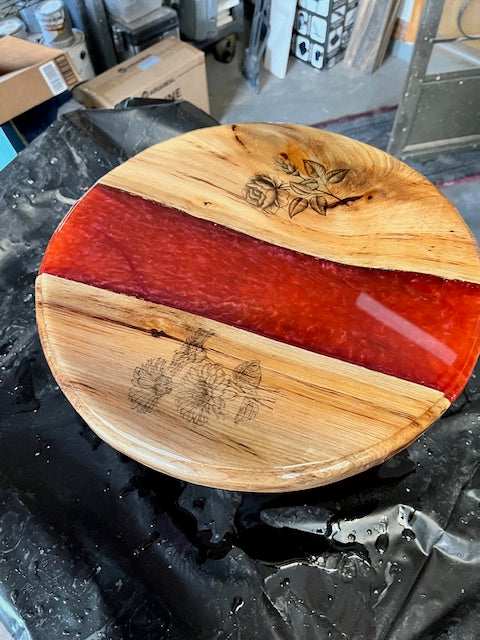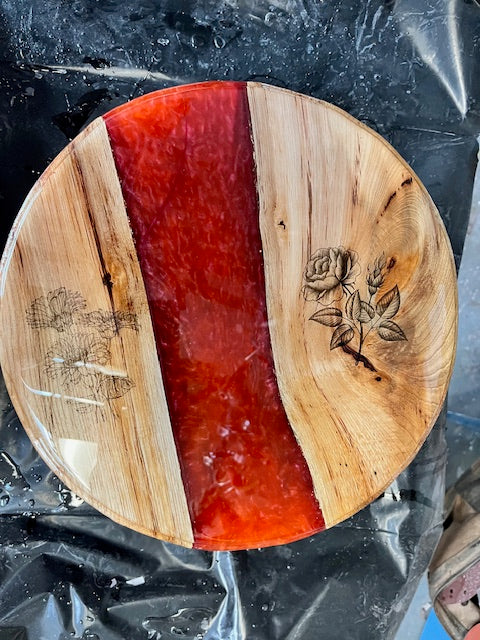 Red river epoxy wall hanger with flowers burned into the hickory wood and coated with epoxy.