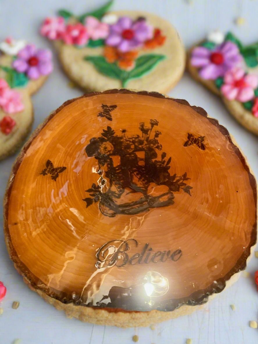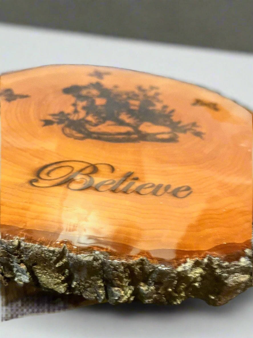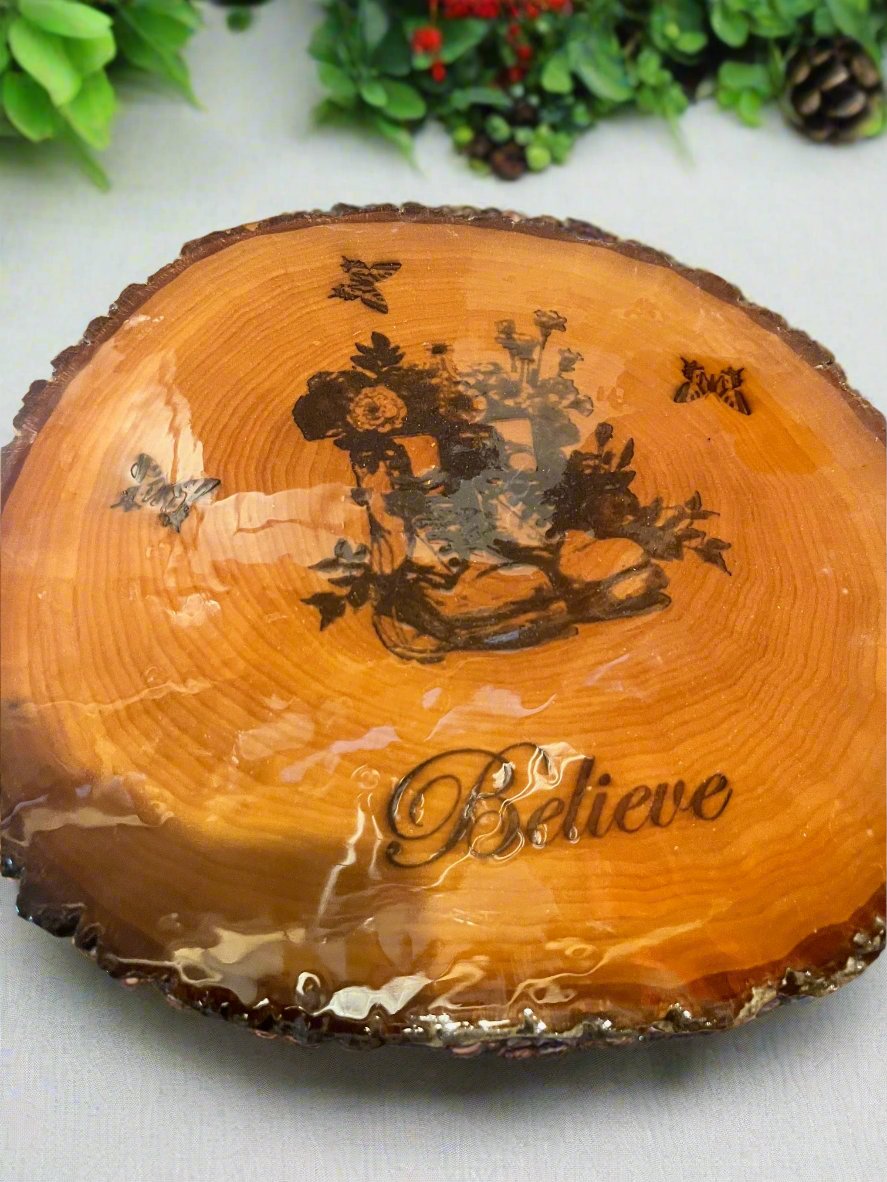 This 14" round table decoration adds a unique touch to any room. The 2" thick epoxy coating provides durability, while the intricate floral laser and butterfly design add a touch of elegance. The word "believe" is engraved, making it one of a kind. Expertly crafted with attention to detail.