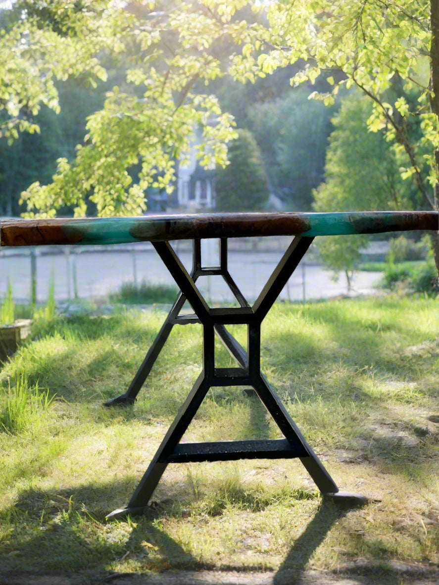 Expertly handcrafted with a unique design, the St Patrick Day Green Table is a stunning addition to any space. With metal legs, two coats of epoxy, and three live edge oak slabs, this 58"x38"x1.5" thick table features two striking green rivers that add a touch of nature to your home.