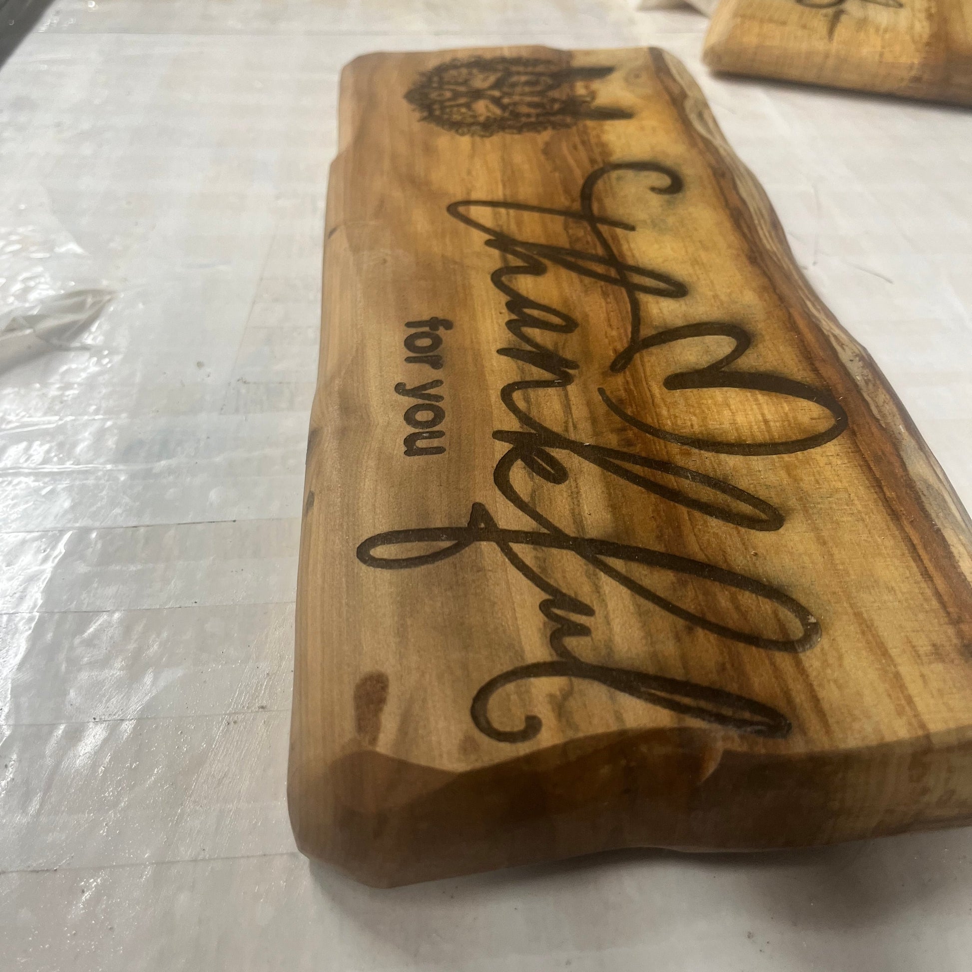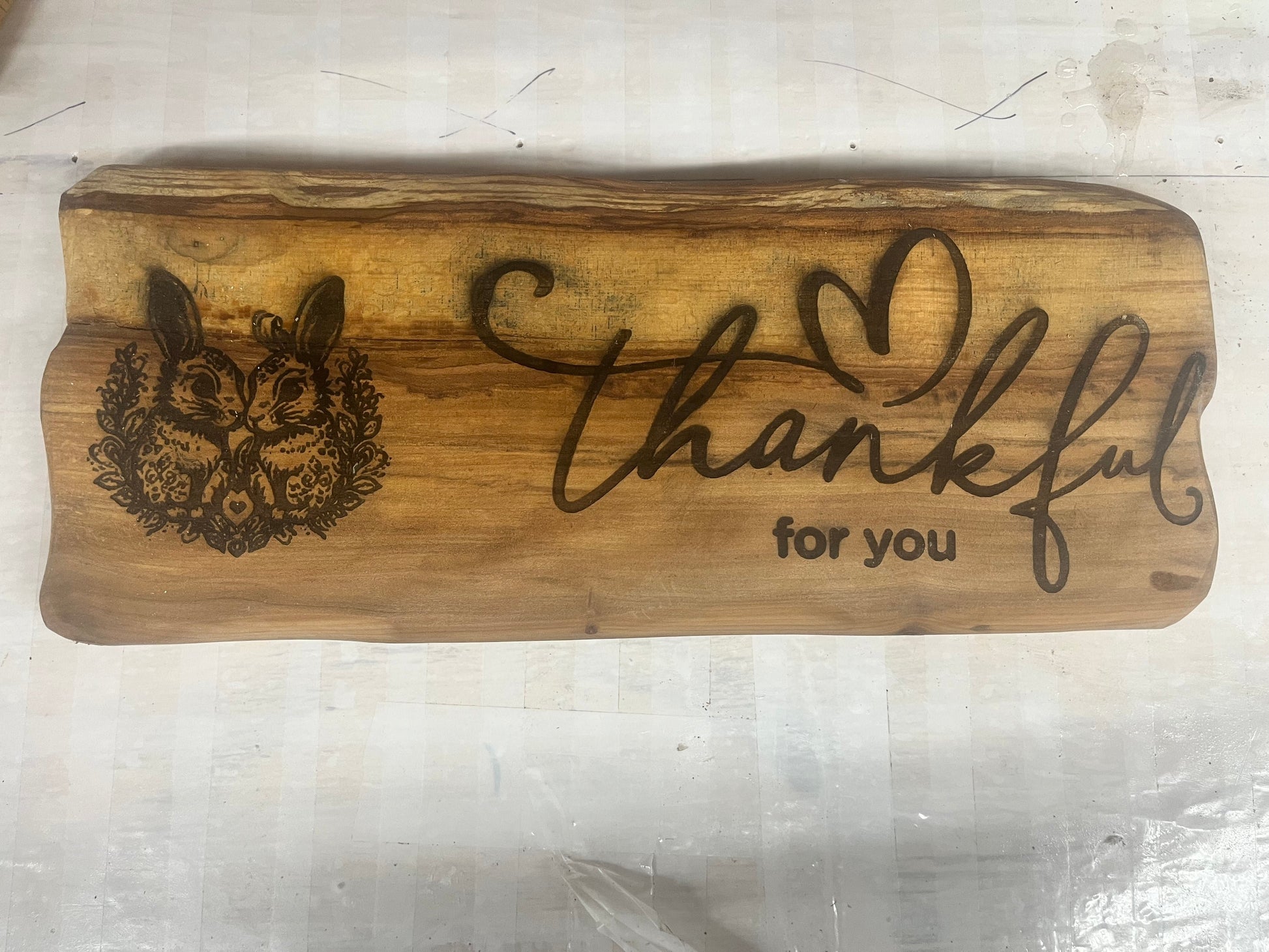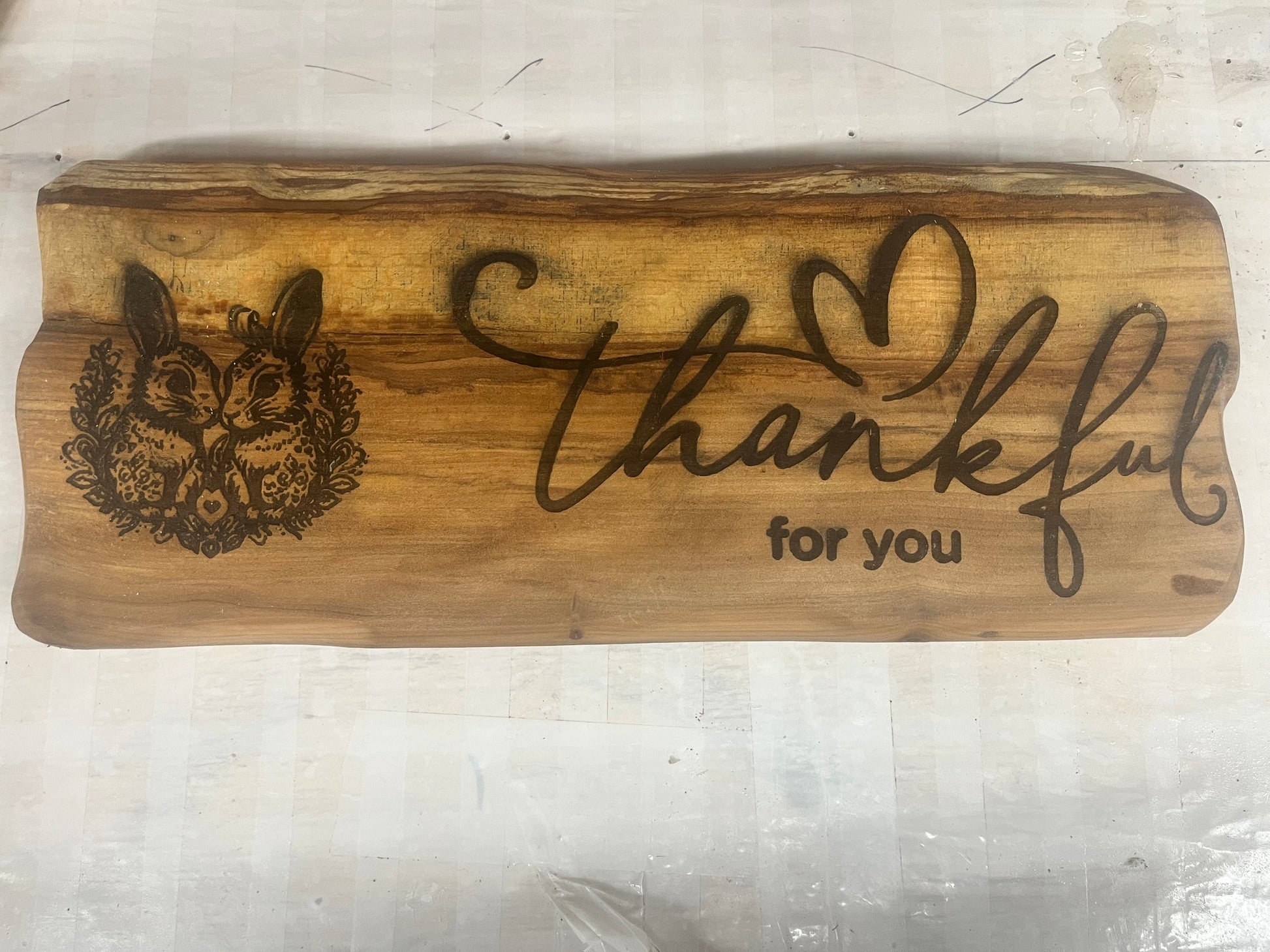 This is a great Plaque Thankful for You with two bunnies holding a heart. Made with live edge Tupelo wood. Measure 16.5" x 6.5" with wall hanging clasp on back.