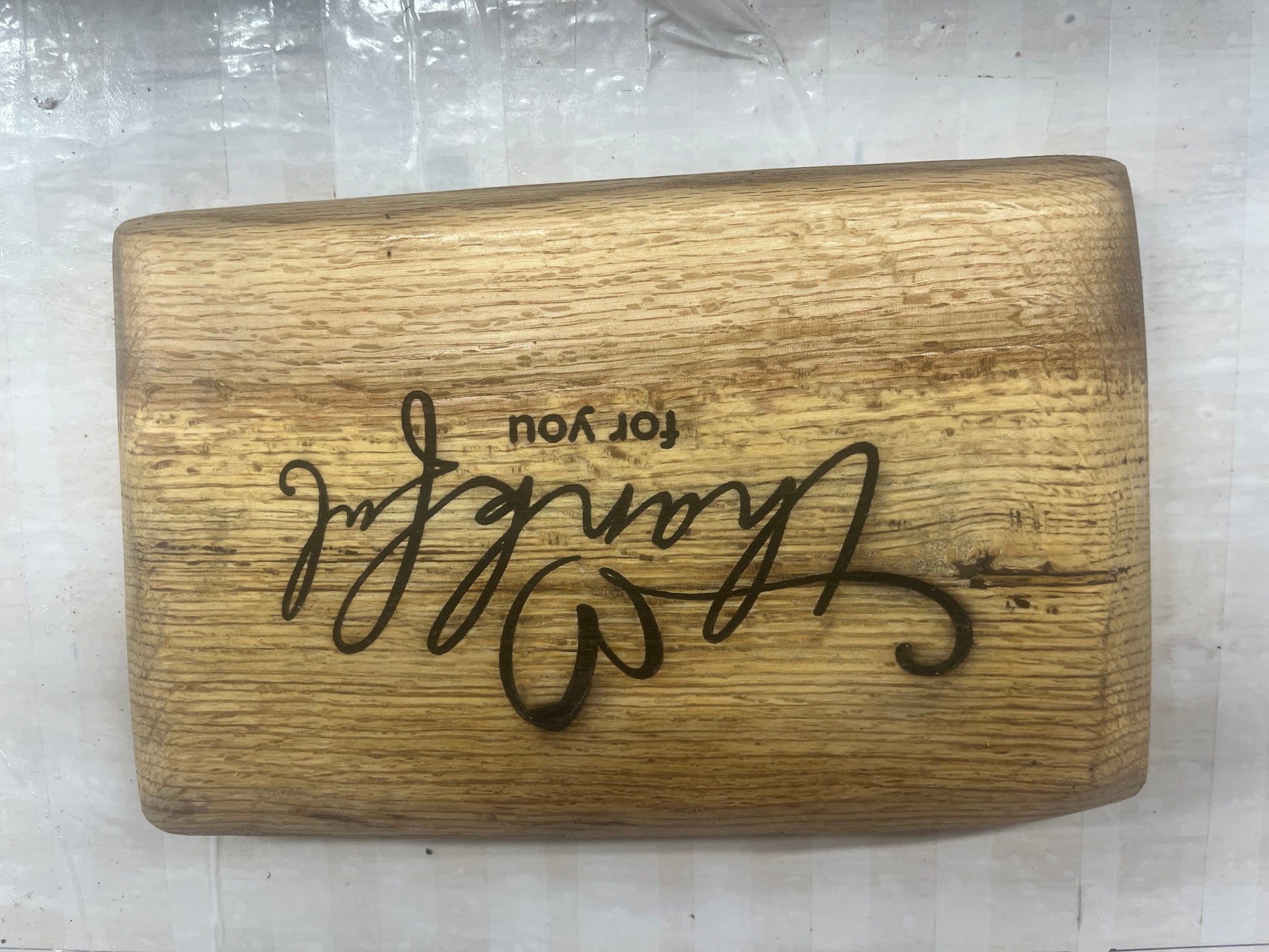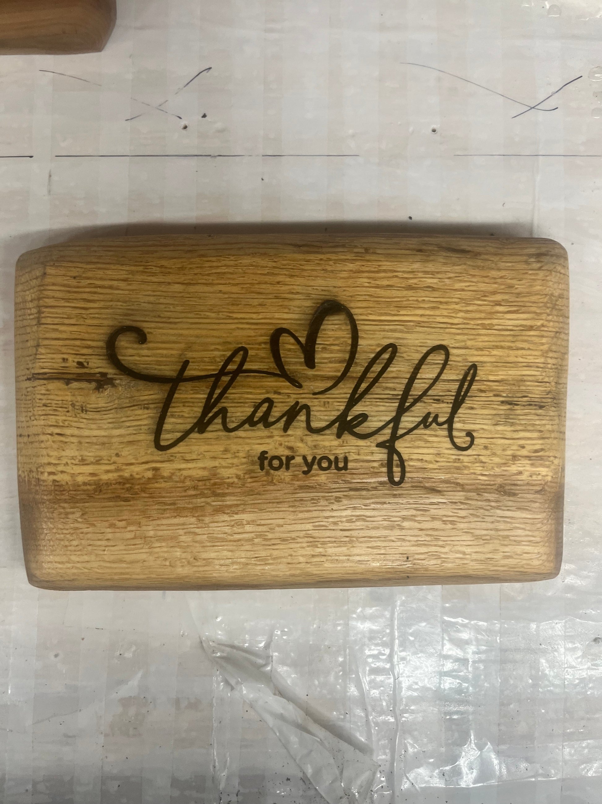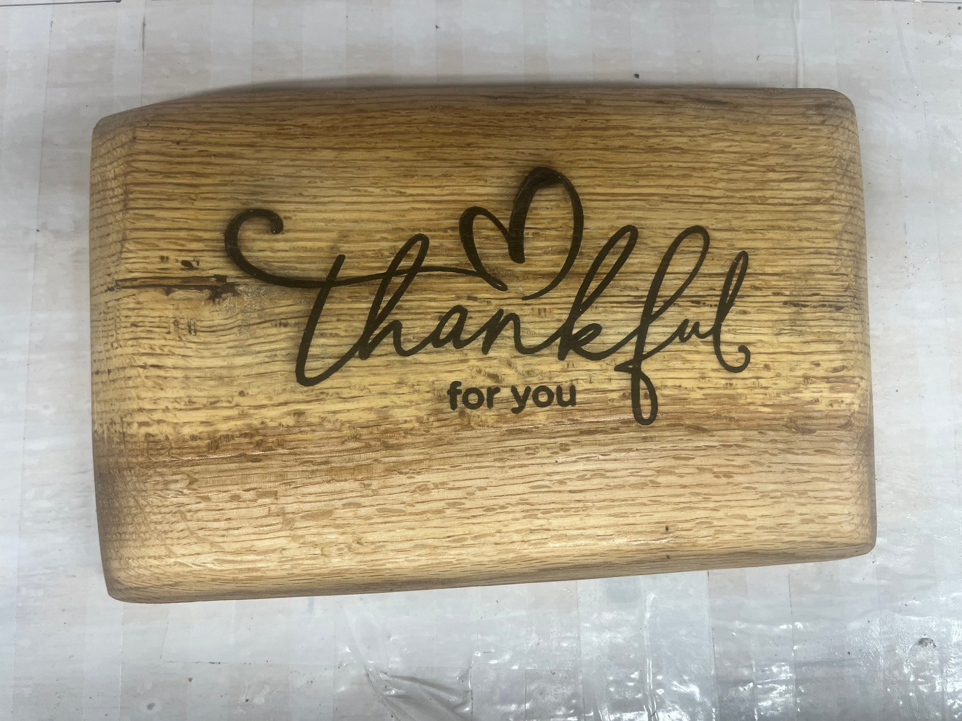 This is oak wood with tongue oil treatment that says Thankful for You with a heart. Measures 7" x 11" with wall hanging bracket.