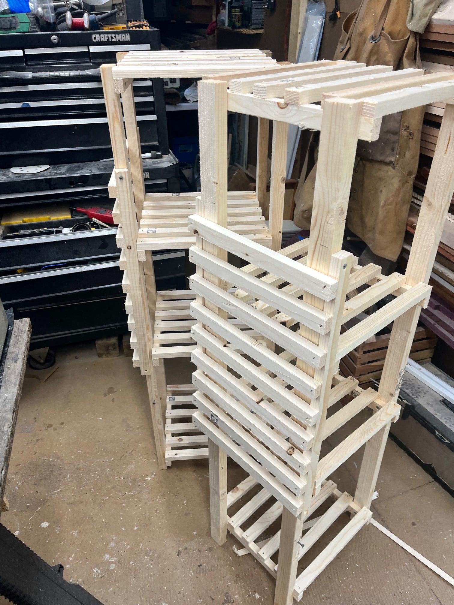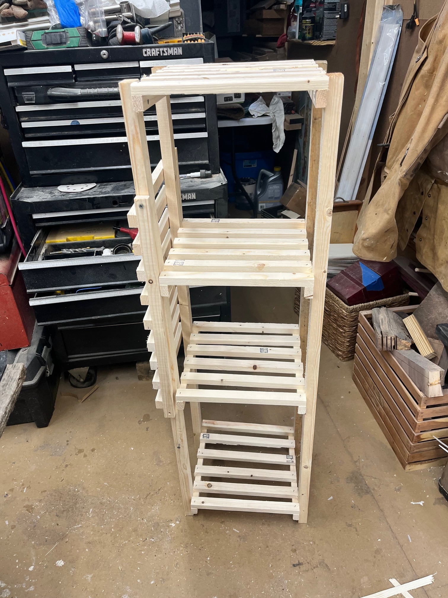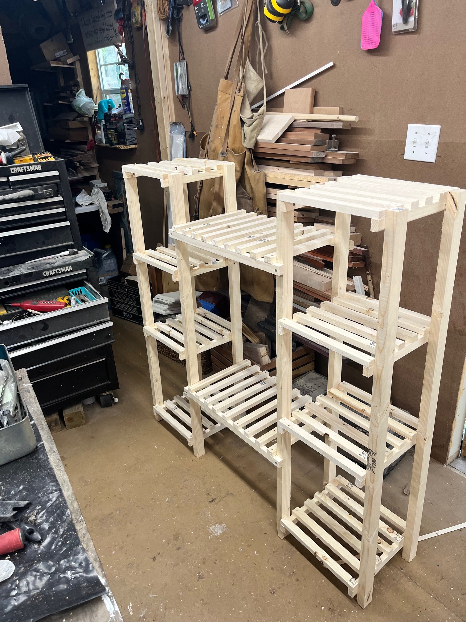 This is a simple 10 shelf plant stand. Made of oak in plan wood, stained or painted. Two tiers have 4 shelves 12"x12" by 12" high. Two center shelves are 12"x 20" 24" high. Total height is 47" total width assembled is 44". this comes in with easy directions to assemble. PLEASE ALLOW 3 WEEKS TO DELIVER