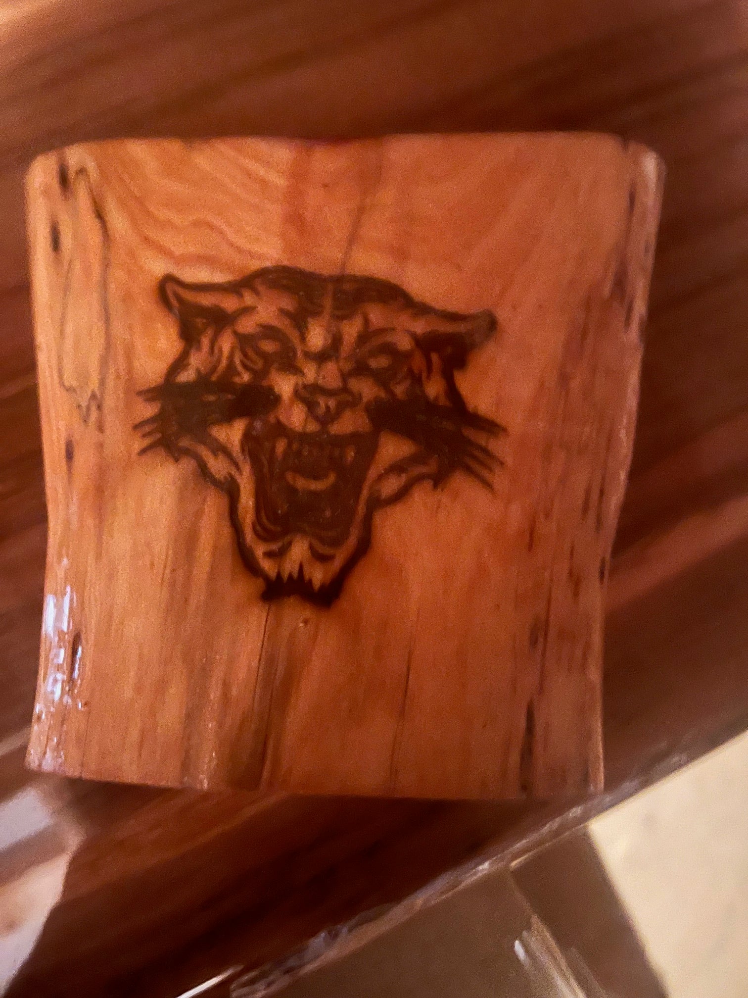 Piece of Tupelo with Tiger face burnt inti it. Epoxy coated for the bright shine' Measures 4"x4" x 3/4" with hanger on back
